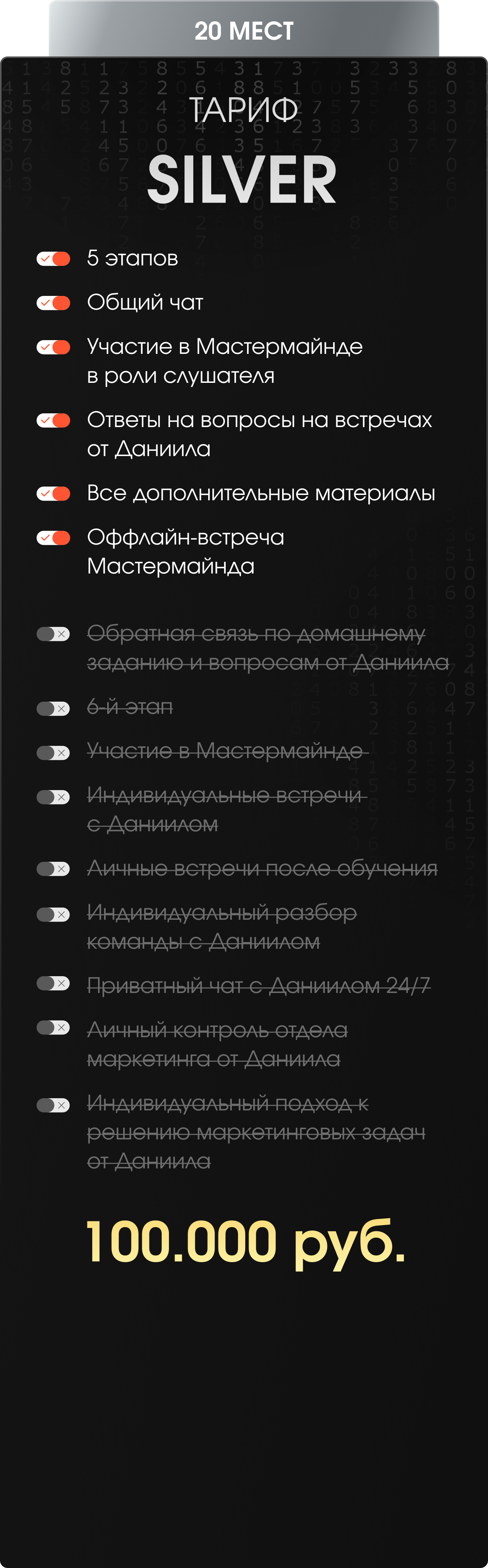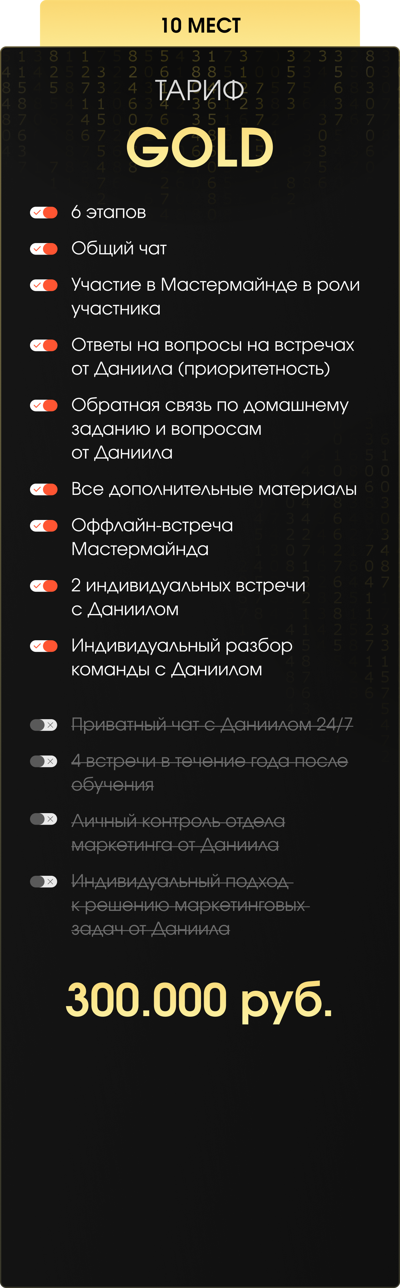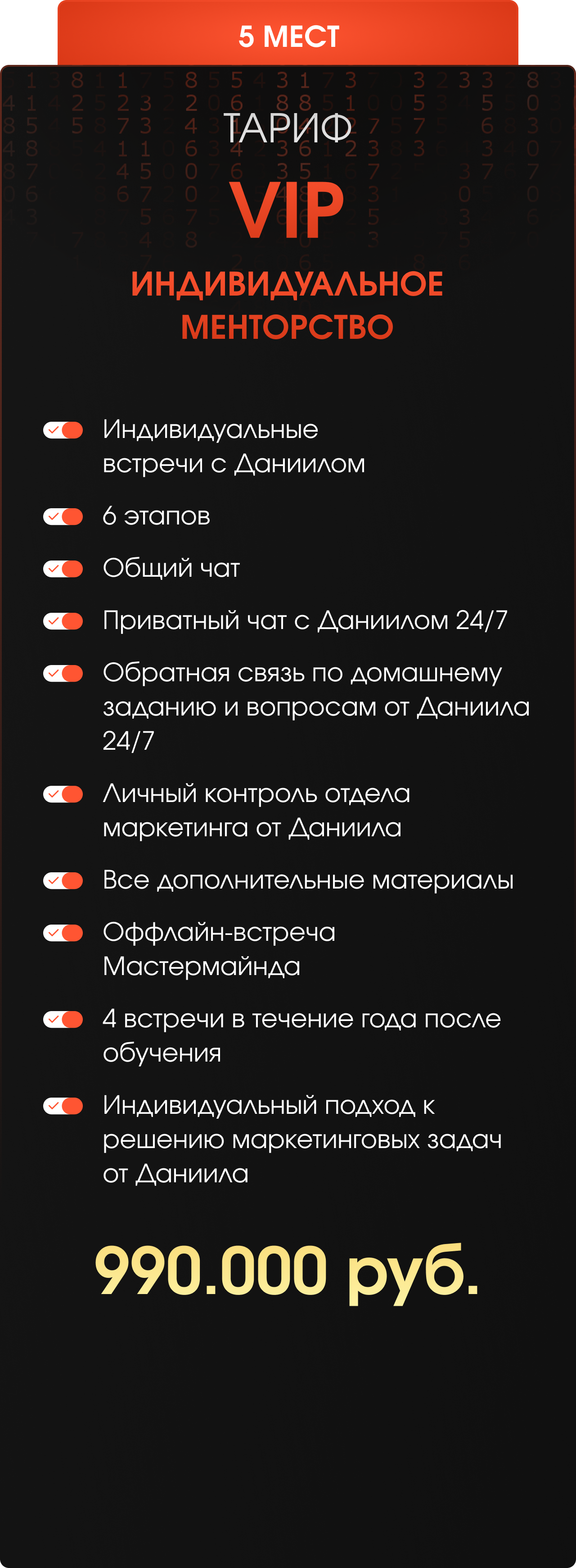 На тарифе «VIP» я лично провожу вас от точки А до точки Б, помогаю с внедрением системы в отдел маркетинга, что позволяет достичь результата быстрее и эффективнее.