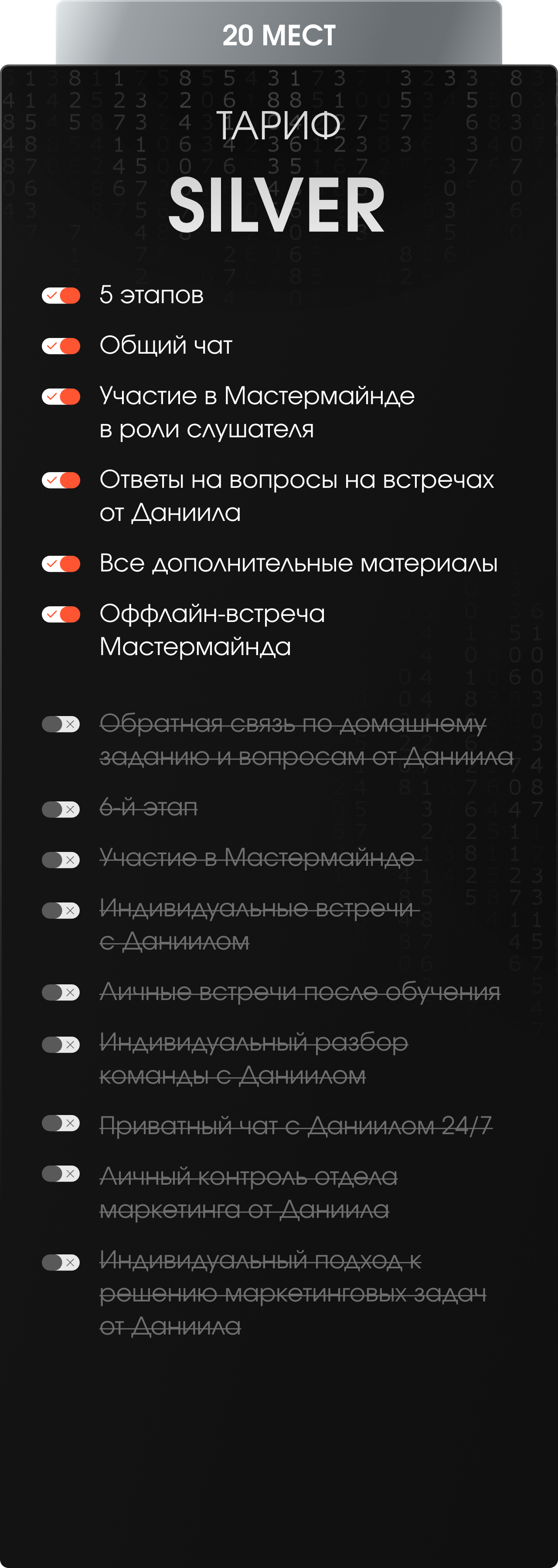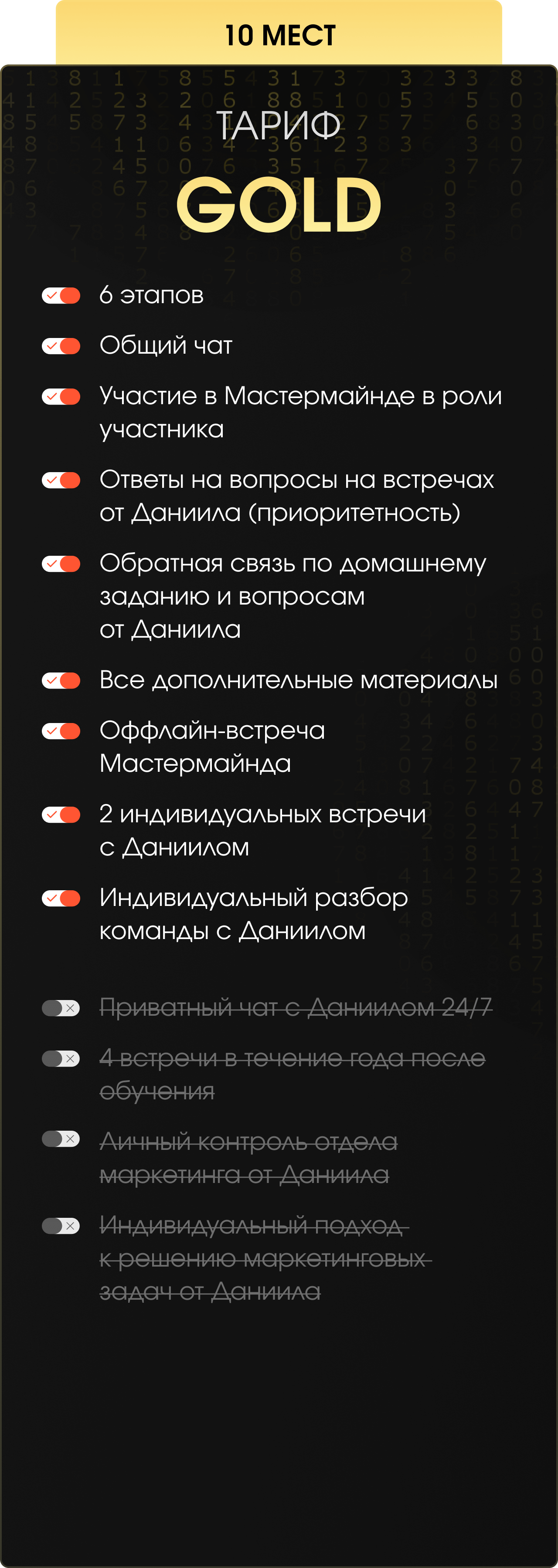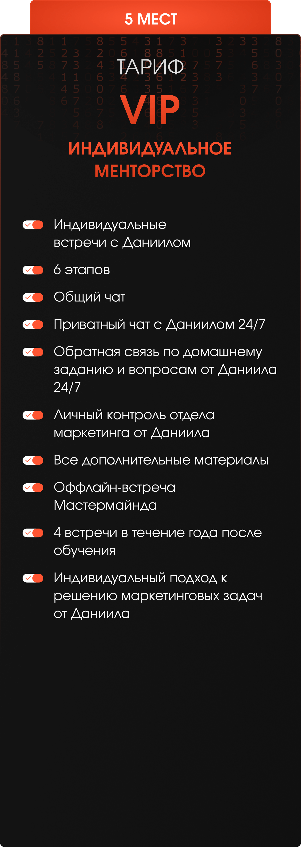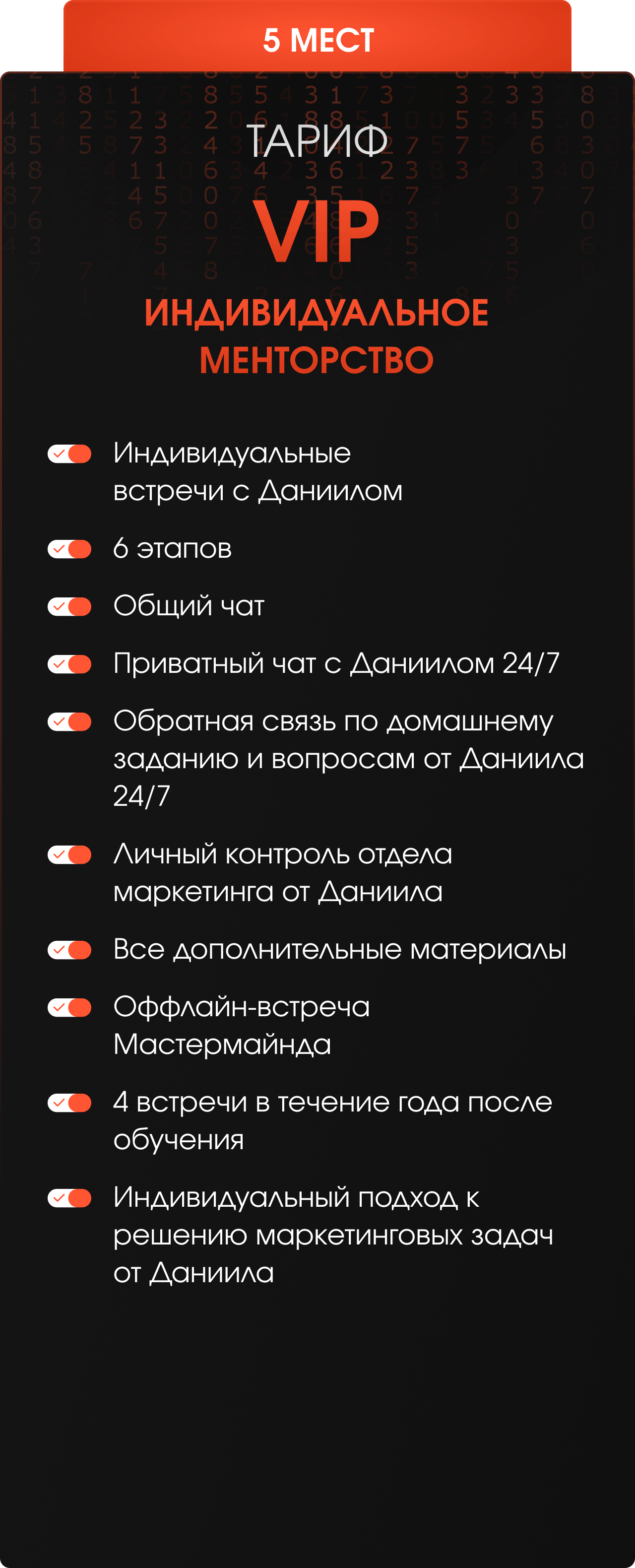 На тарифе «VIP» я лично провожу вас от точки А до точки Б, помогаю с внедрением системы в отдел маркетинга, что позволяет достичь результата быстрее и эффективнее.